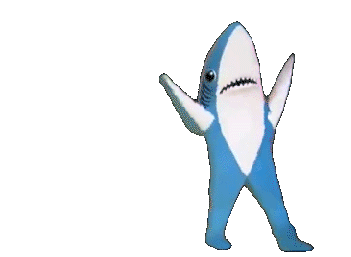 A person in a blue and white shark costume performs the iconic Macarena dance with enthusiasm.