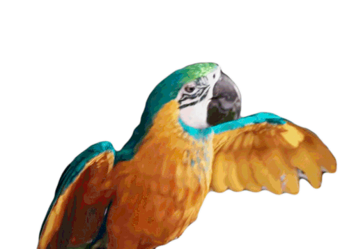 A vibrant Macaw parrot opens its beak wide, appearing to squawk or talk, showcasing its colorful feathers and expressive nature.