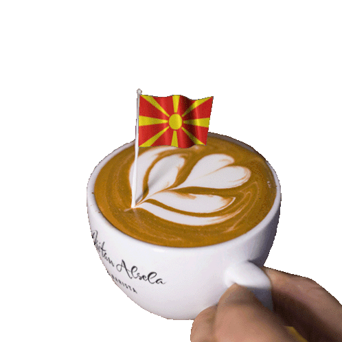 A hand holds a coffee cup with North Macedonia flag and beautiful latte art by Dritan Alsela.