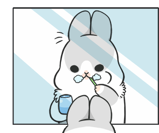 Machiko Rabbit brushes its teeth in front of a mirror, holding a green toothbrush and a blue cup.
