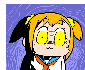 Popuko from Pop Team Epic transforms from a neutral expression to a wide-eyed, stressed, and angry face with a swirling purple background.
