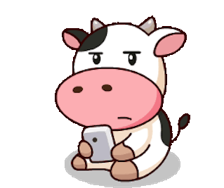 A cute cartoon cow sits, holding a smartphone, and changes its expression from a happy smile to a grumpy, annoyed look.