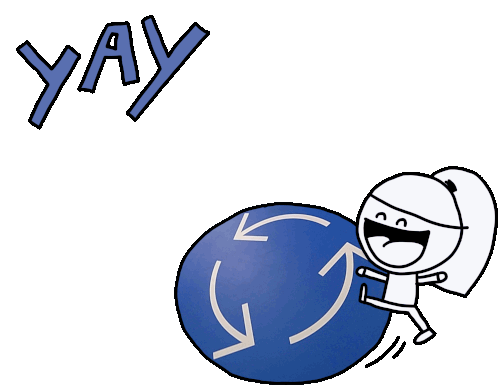 Madebyminka's cheerful character jumps excitedly on a blue sphere with arrows, exclaiming 'YAY' in pure joy.