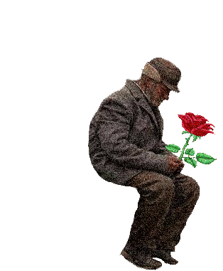 An old man in a hat and coat sits contemplatively, holding a red flower that animates and changes shape.