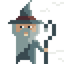A charming pixel art wizard with a long grey beard and a pointed hat, holding a staff, ready for magic.
