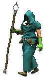 A pixel art Daggerfall Elder Scrolls mage in a hooded robe, holding a glowing staff, ready for magic.