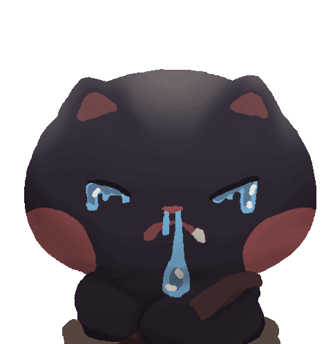 A cute black Magi Cat crying with tears and a snot bubble inflating and deflating from its nose.