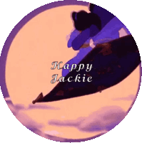 Happy Jackie and Princess Jasmine from Aladdin flying on a magic carpet under a full moon in the night sky.
