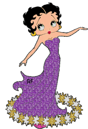 Betty Boop in a sparkling purple and pink dress, posing with a magical hula hoop made of gold and silver stars.