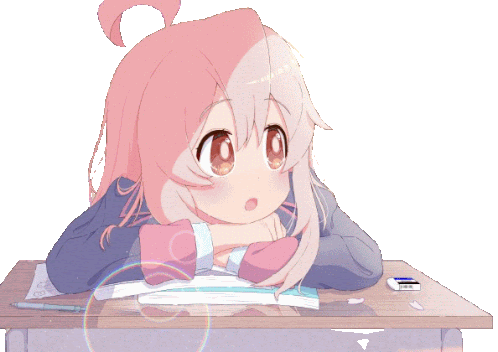 a girl with pink hair sits at a desk with a eraser on it
