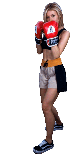 Yulianna Karaulova in a dynamic boxing pose, wearing red gloves and athletic gear, ready for action.