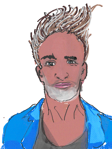 Maikbaber Hacon, a stylized man with spiky hair and a beard, wearing a blue jacket.