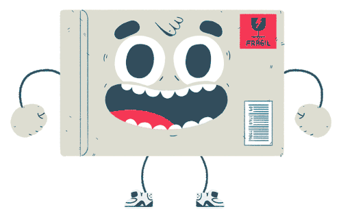An animated, excited mail envelope character with a wide smile and a "FRAGIL" sticker, expressing happiness.