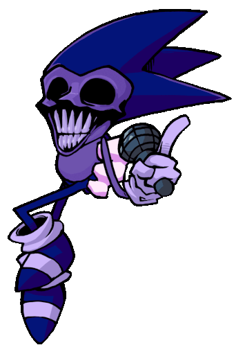 Majin Sonic, the eerie, skeletal version of Sonic, stands with a microphone in hand and gives a thumbs-up, showcasing his menacing grin.