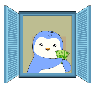 A cute blue and white penguin, Bulla, in a window makes it rain money, holding a stack of bills.