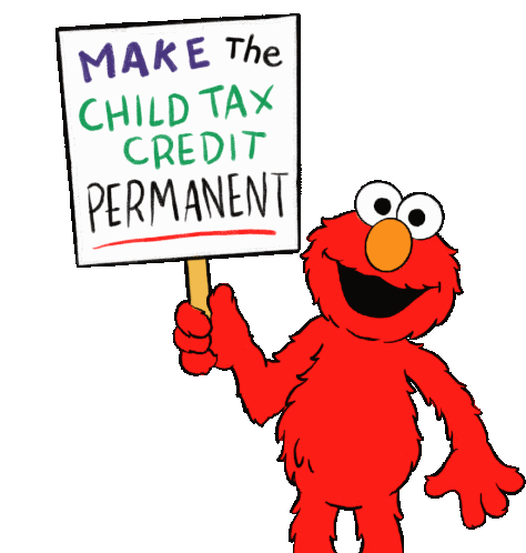 Elmo from Sesame Street holds a sign advocating for the Child Tax Credit to be made permanent.
