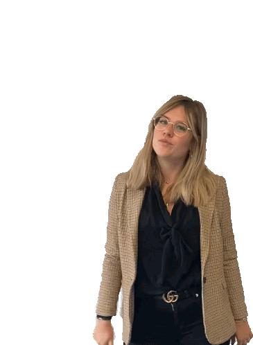 A confident woman, possibly a real estate broker, makes a triumphant fist gesture, symbolizing success and achievement.
