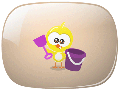 A cute yellow chick builds a sandcastle with a bucket and shovel, then gets surprised by a crab.