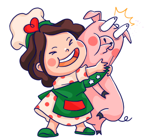 Mamachoice cartoon girl in a chef's hat and apron happily hugs a surprised pink pig.