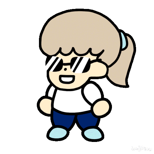 Mamy Mamy Waffle character, a cartoon girl with a ponytail and cool sunglasses, doing a fun neck dance.