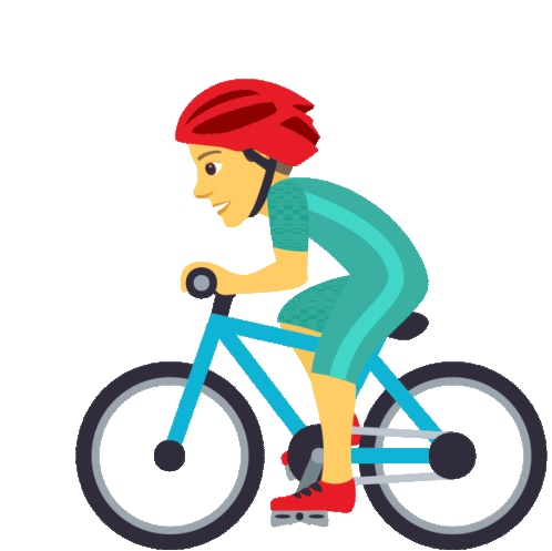A Joypixels-style animated sticker of a person in a cycling suit and red helmet, actively riding a bicycle.