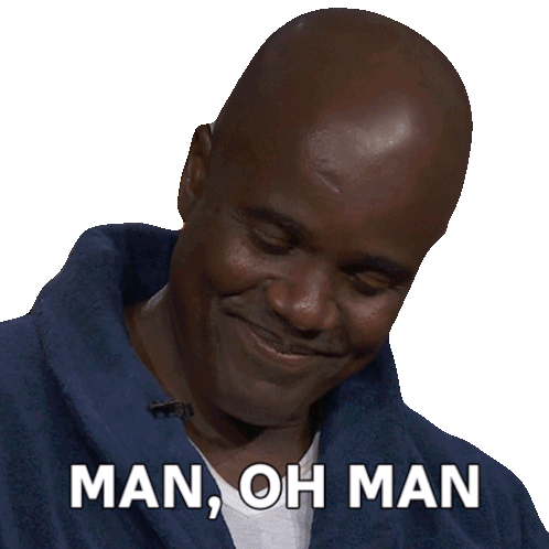 Wes Hall, from Dragons' Den, reacts with a smile, exclaiming 'Man, Oh Man' in a moment of surprise or amusement.
