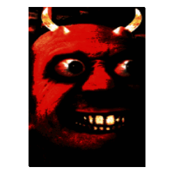 Animated sticker of a creepy, red-faced devil with horns, wide eyes, and a toothy grin, designed for a jumpscare effect.