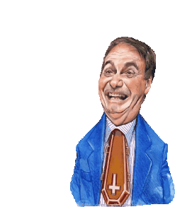A caricature of Jair Bolsonaro, depicted as 'Mandrião Bolsonaro Corrupto', wearing a coffin-shaped tie.