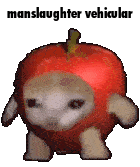 An animated, pixelated red apple-like creature with small limbs spins, displaying "manslaughter vehicular" text. Its face changes to a cat.