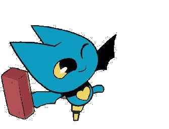 Adorabat from Mao Mao: Heroes of Pure Heart, first wielding a brick, then flashing a mischievous, toothy smile.