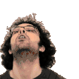 Marc Jam from Trackmania, a man with curly hair and glasses, slowly looks up with an expression of ecstasy.