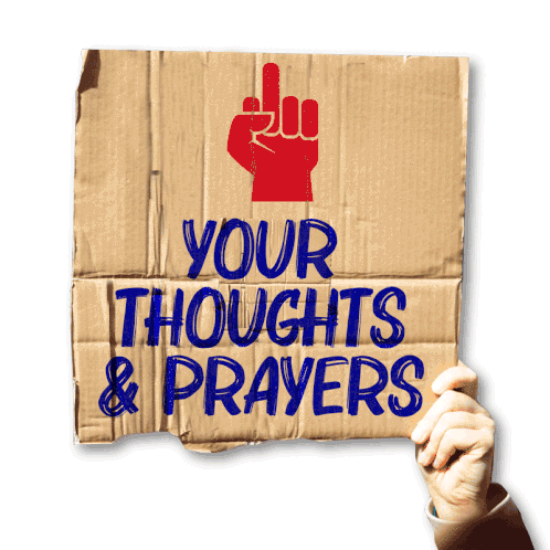 A hand holds a cardboard sign with a red middle finger graphic and the text 'YOUR THOUGHTS & PRAYERS'.