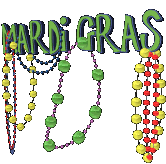 An animated sticker featuring the word 'Mardi Gras' in green 3D letters, adorned with colorful, swaying Mardi Gras beads.