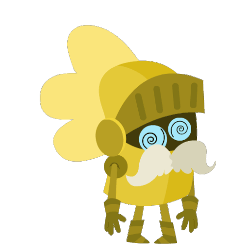 A yellow robot knight character with a mustache and helmet looks dizzy with swirling eyes, indicating a headache.