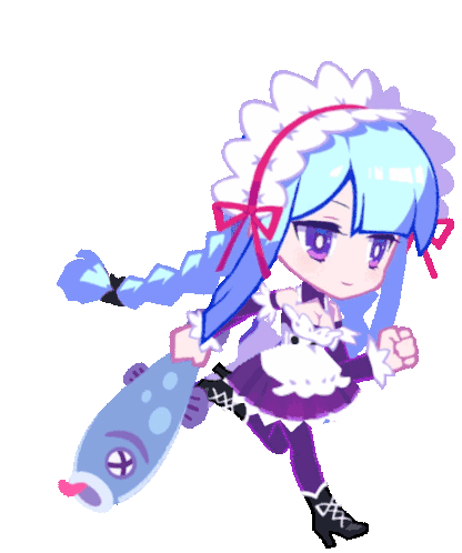 a cartoon girl with blue hair and a maid outfit is holding a fish