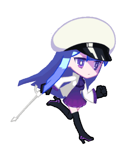 a cartoon drawing of a girl with long blue hair wearing a white hat