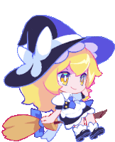 Marija from Musedash and Touhou, a cute pixel art witch, flies on her broomstick with a cheerful expression.