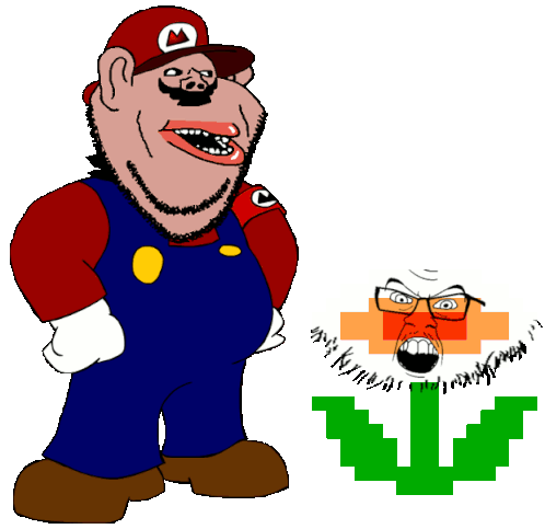 An animated sticker featuring a cartoon Mario character with a pixelated Soyjak face, perfect for meme reactions.