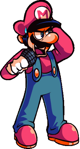 Mario from the FNF Mario's Madness mod in his "I Hate You" up pose, looking surprised with arms raised.