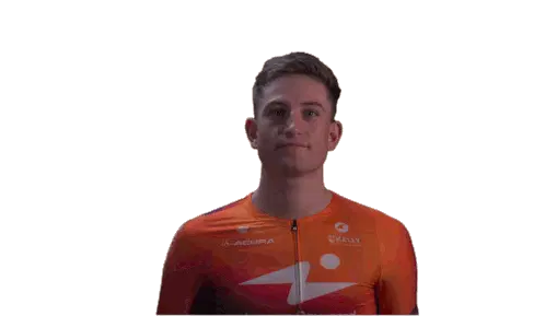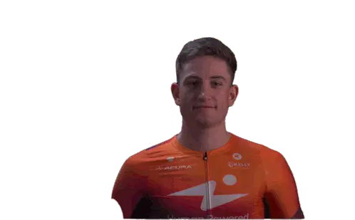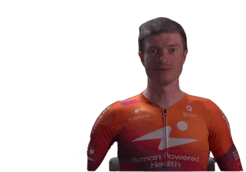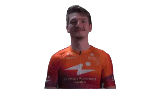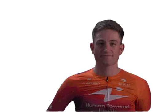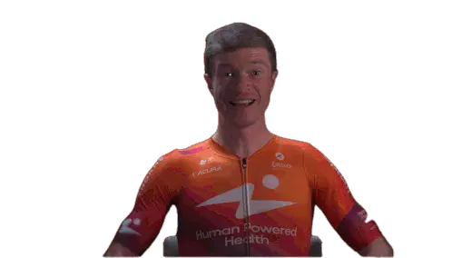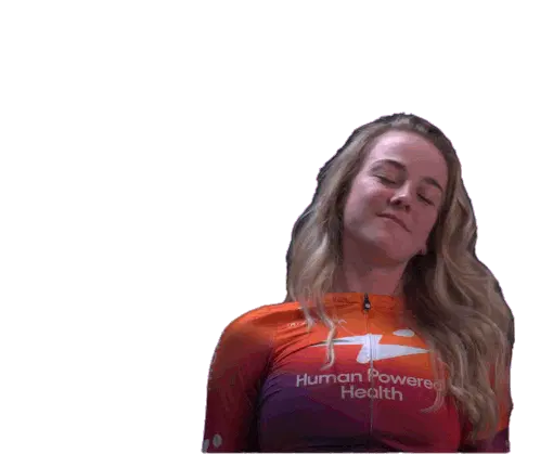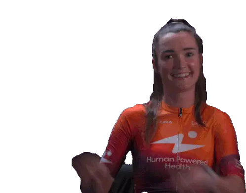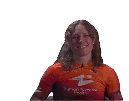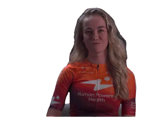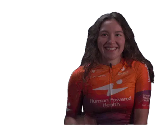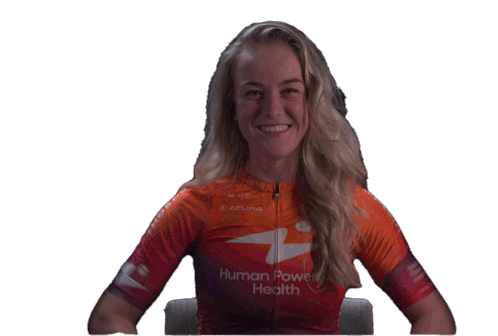 Marit Raaijmakers, a cyclist for Human Power Health, makes a rock on gesture with both hands, showing excitement and energy.