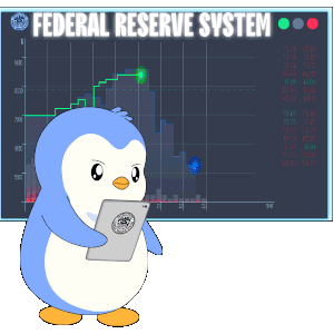 A cute penguin holds a tablet, pointing to a Federal Reserve System screen displaying a Bitcoin market chart.