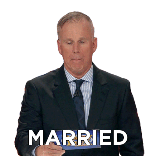 Gerry Dee on Family Feud Canada announces "MARRIED" with a card, indicating a relationship status or survey answer.