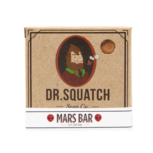 Dr. Squatch Mars Bar soap box sticker, featuring the brand's iconic Bigfoot logo and "Mars Bar" branding.