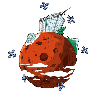 A cute cartoon penguin sits on a red Mars-like planet, surrounded by orbiting satellites and a 'SPACE' building.