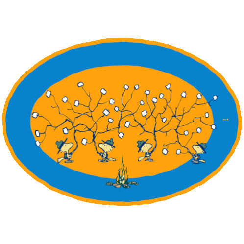 Snoopy and Woodstock, as Beagle Scouts, proudly display their "Marshmallow Roasting Champions" title around a campfire.