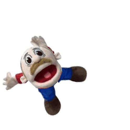 a stuffed toy with a mustache and a red shirt is flying in the air