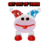 Marx from Kirby, wearing a jester hat and red shoes, with the text 'GET OUT OF TOWN' above him.