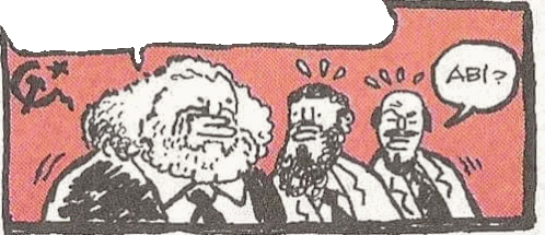 a cartoon of three men with beards talking to each other with a speech bubble that says abi .