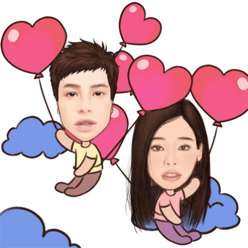 Marydon and a loved one float happily with pink heart balloons and blue clouds, sharing a moment of love.