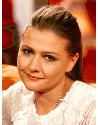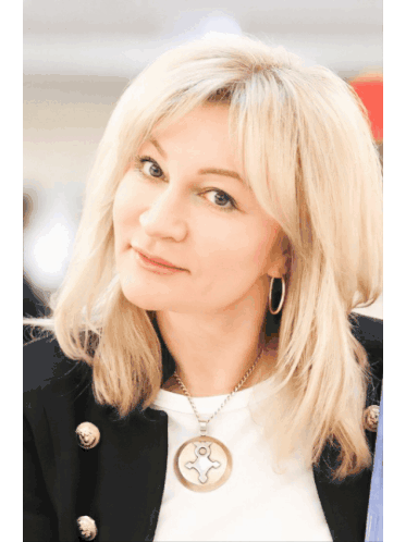 a woman wearing a black jacket and a white shirt has a necklace with a gold pendant